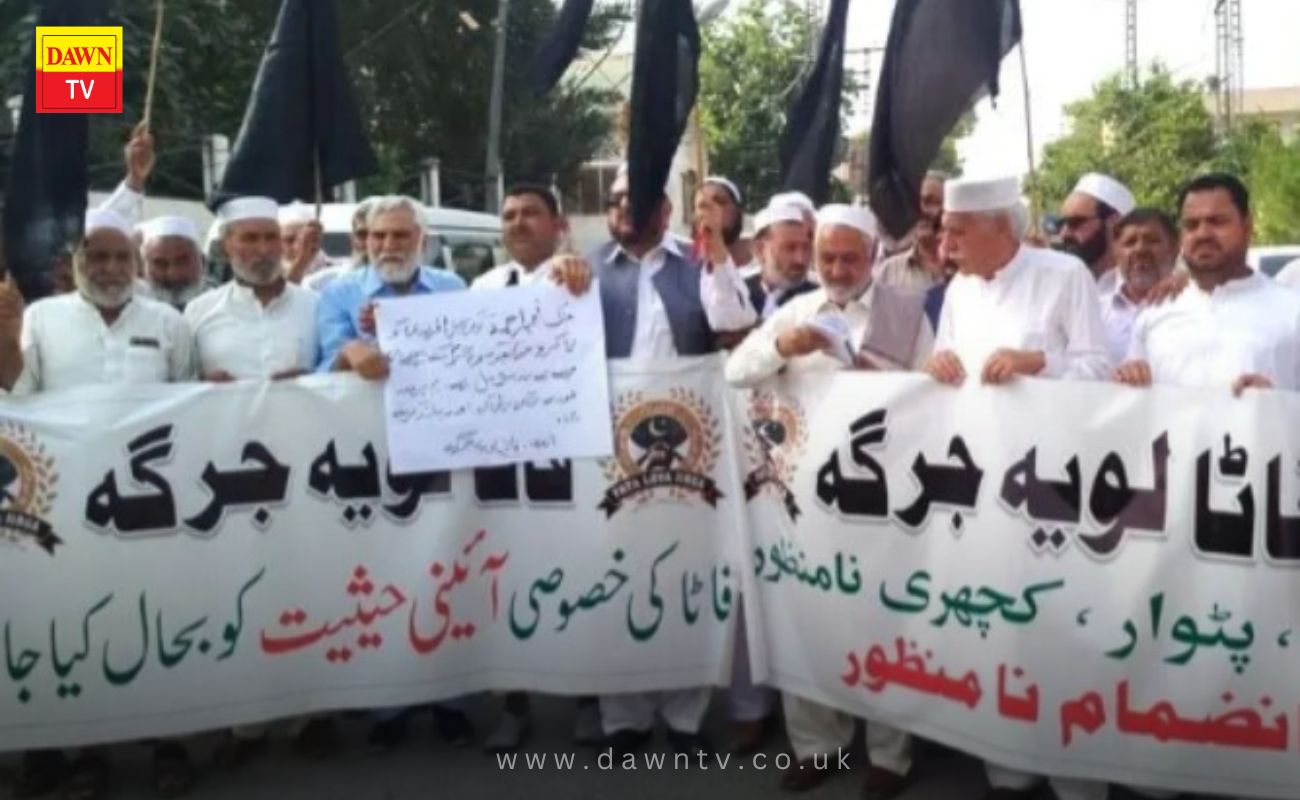 پشاور: فاٹا لویہ جرگہ کے زیر اہتمام قبائلی عوام نے پشاور پریس کلب کے باہر احتجاجی مظاہرہ کیا جس میں بڑی تعداد میں قبائلی مشران، نوجوان اور سول سوسائٹی کے نمائندگان شریک ہوئے۔